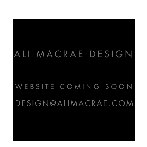 Black background with white text promoting Ali Macrae Design, indicating the website is coming soon and providing an email contact.